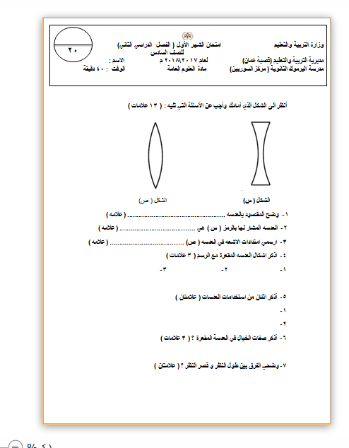 ورق عمل العدسات فيزياء صف عاشر فصل أول زاد