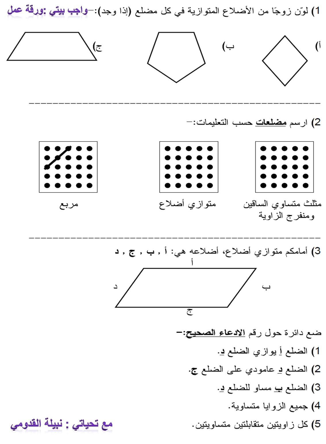 ورقة عمل متوازي الأضلاع المستوى الثاني رياضيات الفصل الثاني المناهج السعودية