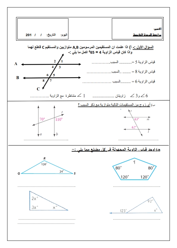 ورقة عمل درس الزوايا والمستقيمات المتوازية