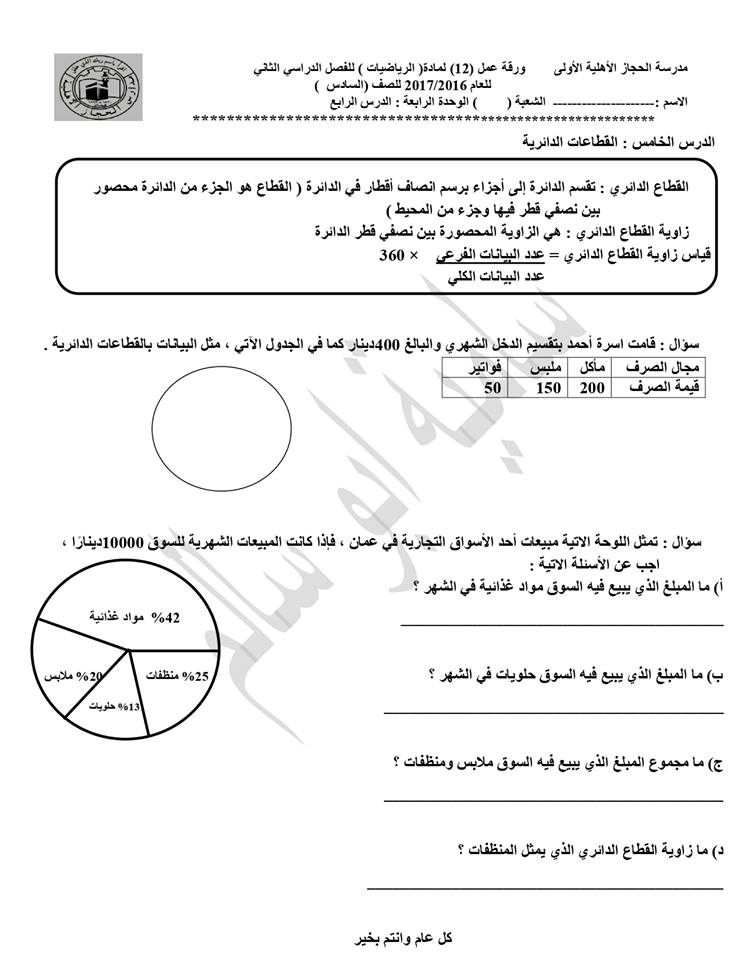 ورقة عمل 6 الصف التاسع رياضيات الفصل الثالث المناهج الإماراتية