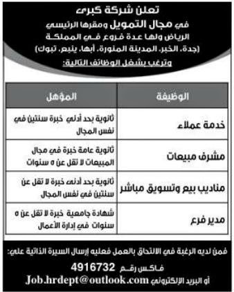 طاقات وظائف في التخصصات الإدارية والمالية والقانونية في كل المناطق